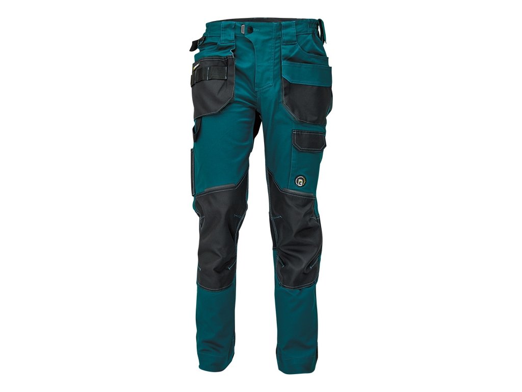 pánské pracovní kalhoty s pružným pasem; elastický inovativní materiál TRIFIBETEX®; odolné trojité prošití nohavic a sedu; Oxford 600D zesílení v oblasti kolen s možností vkládání kolenních výztuh; prostorné multifunkční přední kapsy s poutky na nářadí; reflexní prvky v barevném odstínu; nastavitelná délka nohavic.