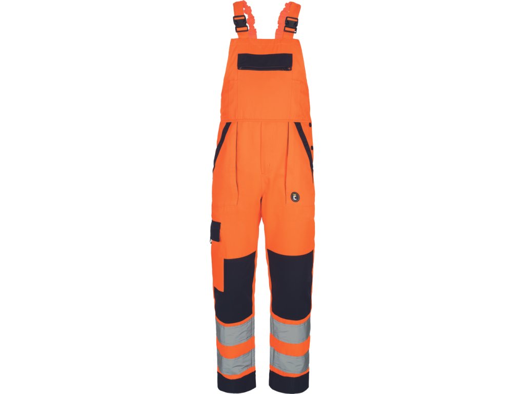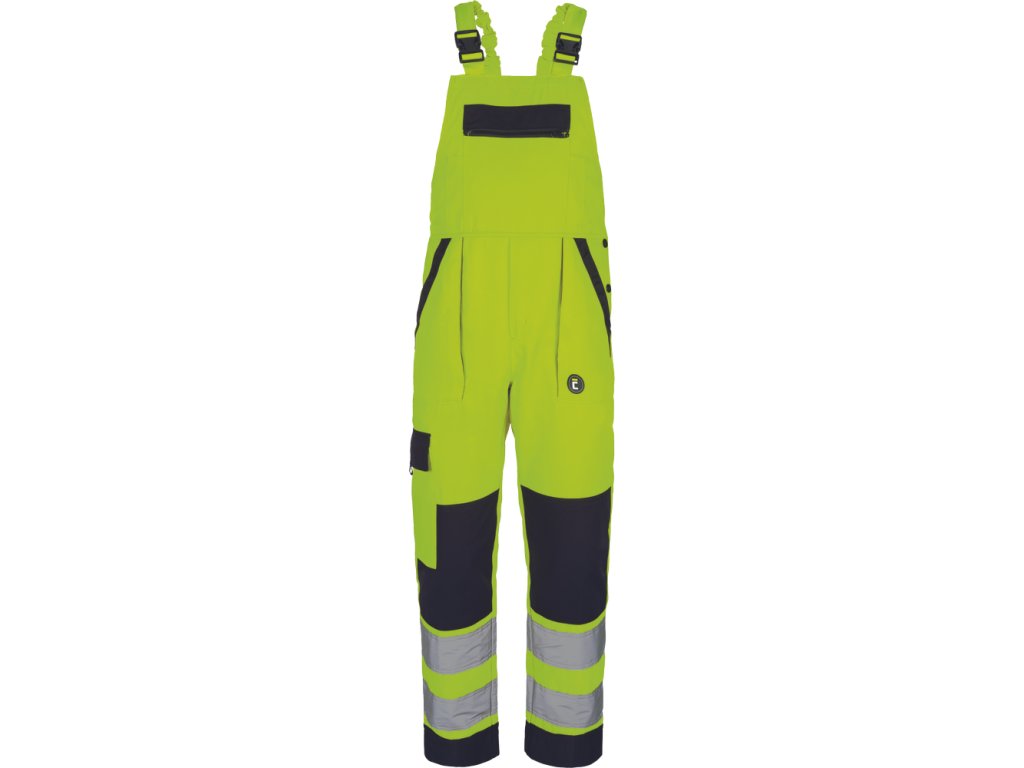 • pánské HI-VIS pracovní laclové kalhoty s elastickým pasem • 2 přední kapsy • 1 stehenní kapsa • 1 velká náprsní kapsa se zapínáním na zip • 2 zadní kapsy se zapínáním na suchý zip • 2 šité 7,5 cm široké reflexní pruhy na spodních částech nohavic • zesílená oblast kolen • nastavitelná délka nohavic