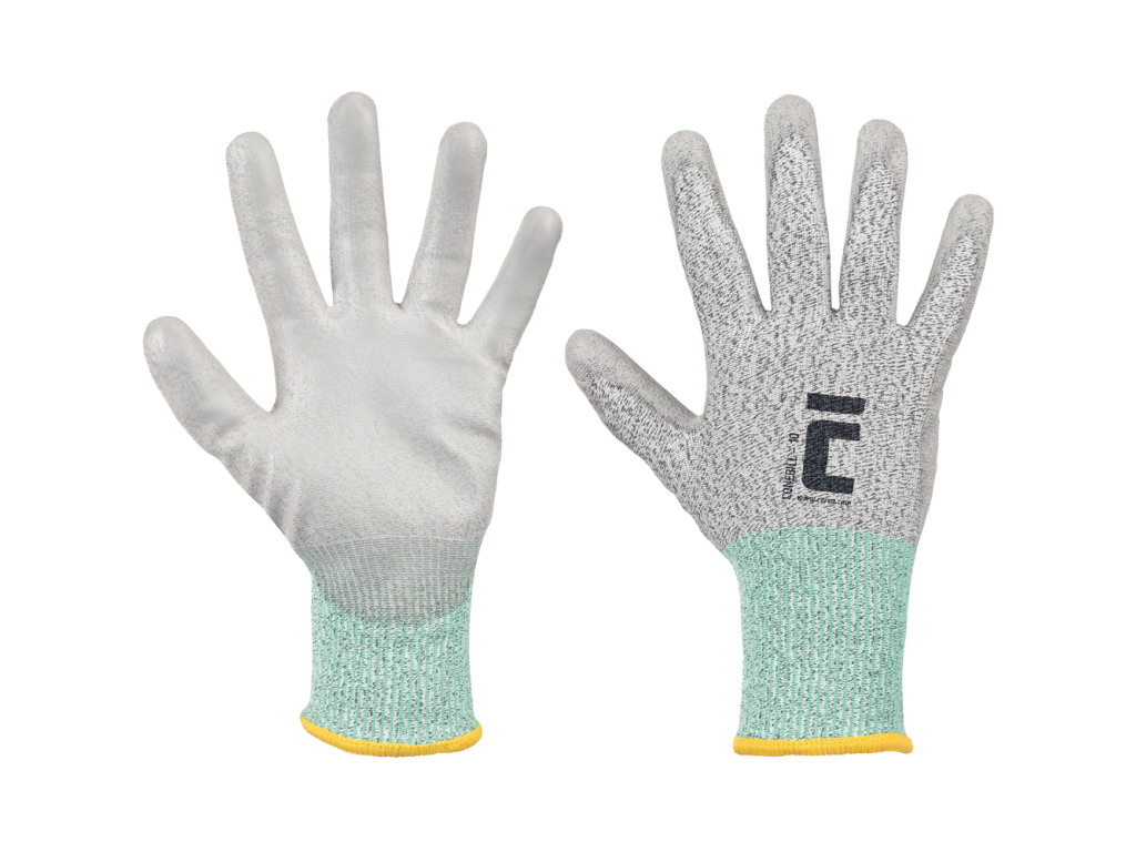 • pletené bezešvé rukavice • kategorie prořezu C • šedý PU na dlani a prstech