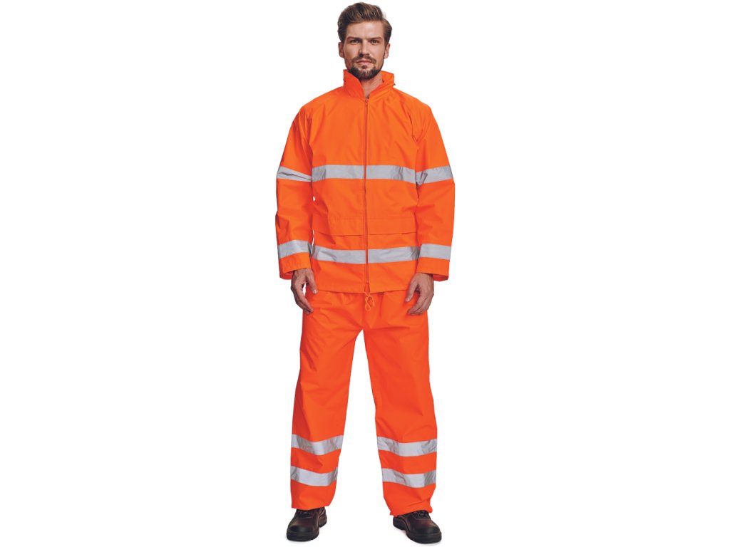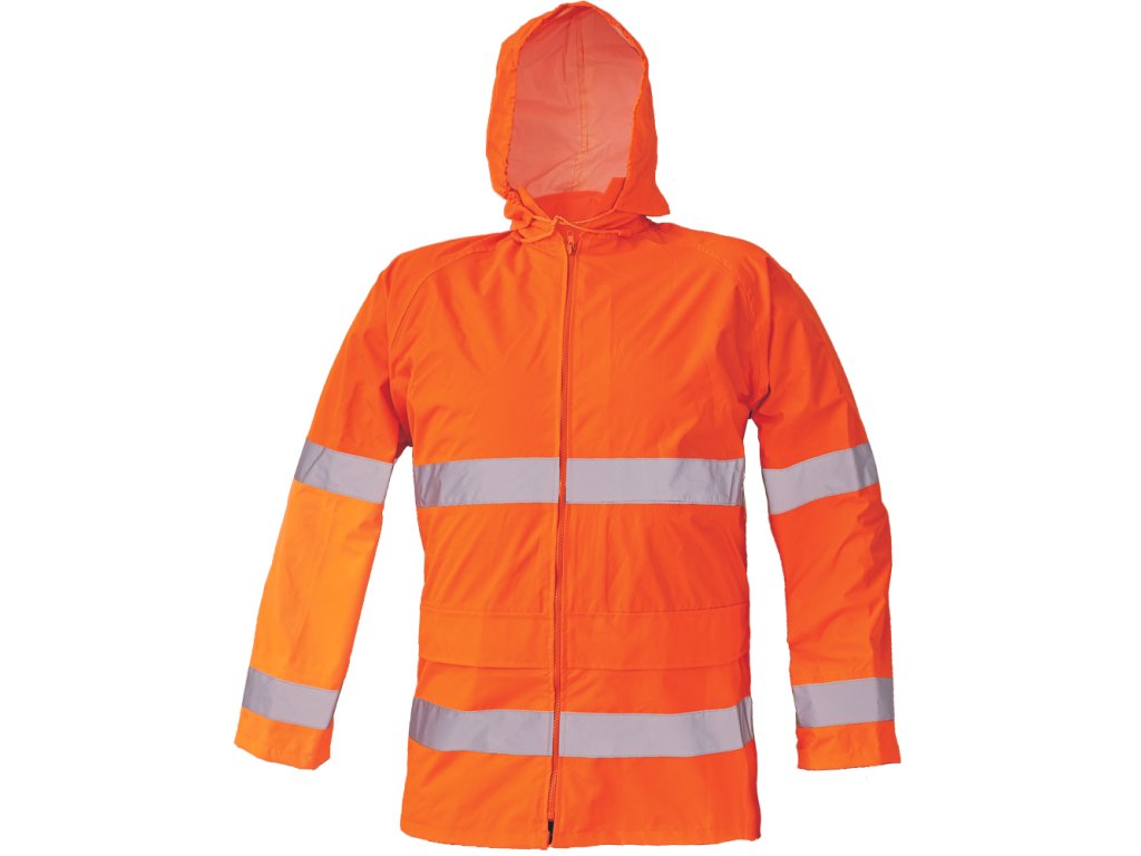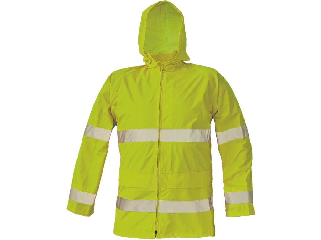 lehká pánská HI-VIS nepromokavá bunda s integrovanou kapucí a reflexními pruhy; vysoká voděodolnost, paropropustná; 2 přední kapsy kryté klopou; spodní lem ke stažení na tkaničku; odvětrávání bundy na zádech a v podpaží; podlepené švy.